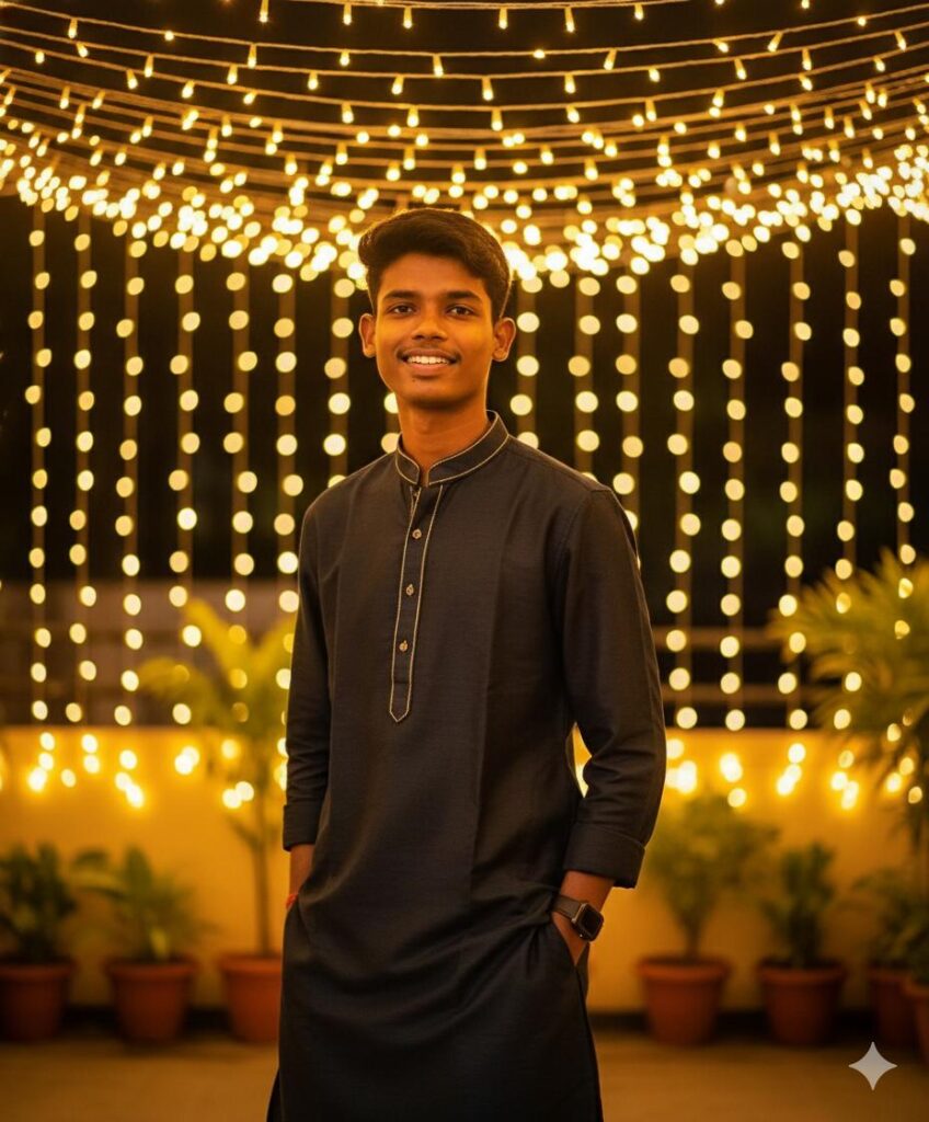 Create a photo-realistic cinematic image using uploaded image to perfectly match the face, hairstyle, pose, and expression. Scene: captured during Diwali night, standing casually near glowing jhalar lights (fairy lights) hanging above and behind. The golden lights fill the background with a beautiful warm bokeh effect. The subject is smiling naturally, body slightly angled, giving a candid confident festive look — exactly like a real professional photoshoot. Outfit: stylish dark-colored kurta with subtle shiny or embroidered detailing that reflects light softly. The outfit should look perfectly fitted and premium, keeping texture realistic. Lighting: warm and cinematic – the jhalar lights act as the main light source, casting soft golden highlights on the face and shoulders. Background filled with glowing bokeh lights for depth. Slight light reflection on the outfit adds realism.Background: softly blurred string lights and green plants, creating a lifestyle Diwali vibe — elegant, cozy, and festive.