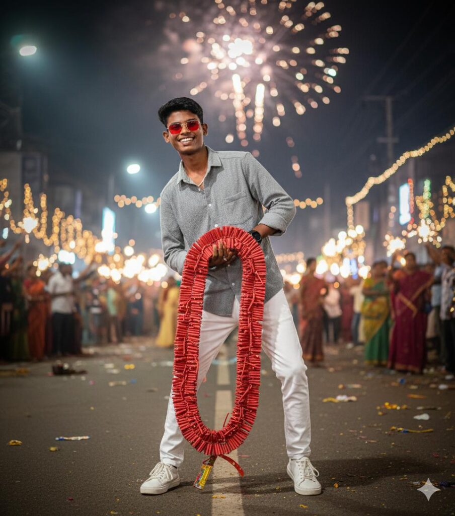 A stylish young man, face in realistic (a face reference) celebration with diwali in street background, my hand in 10000 wala red Garland crackers in the rode. Grey popcorn shirt, white jean and white shoe, red frame sunglasses.