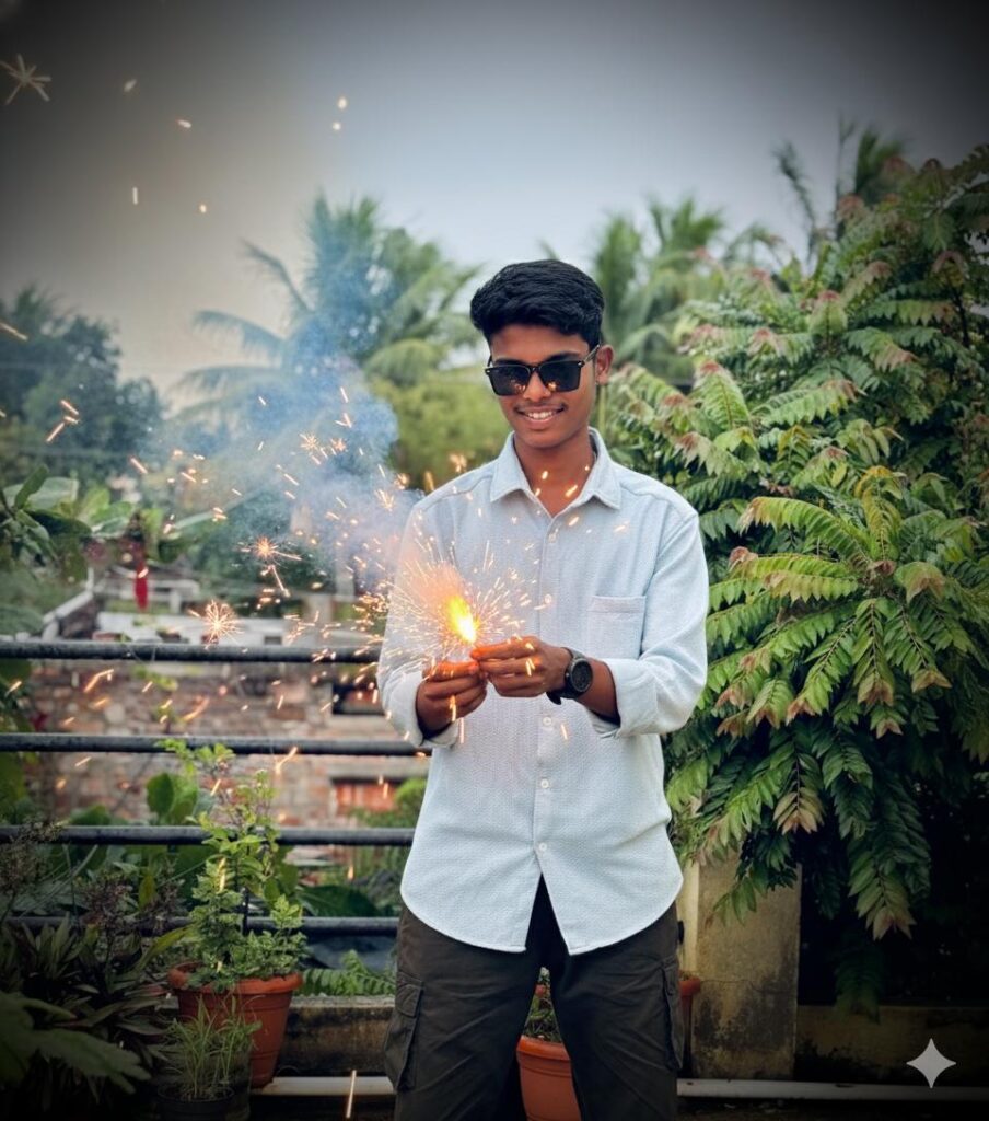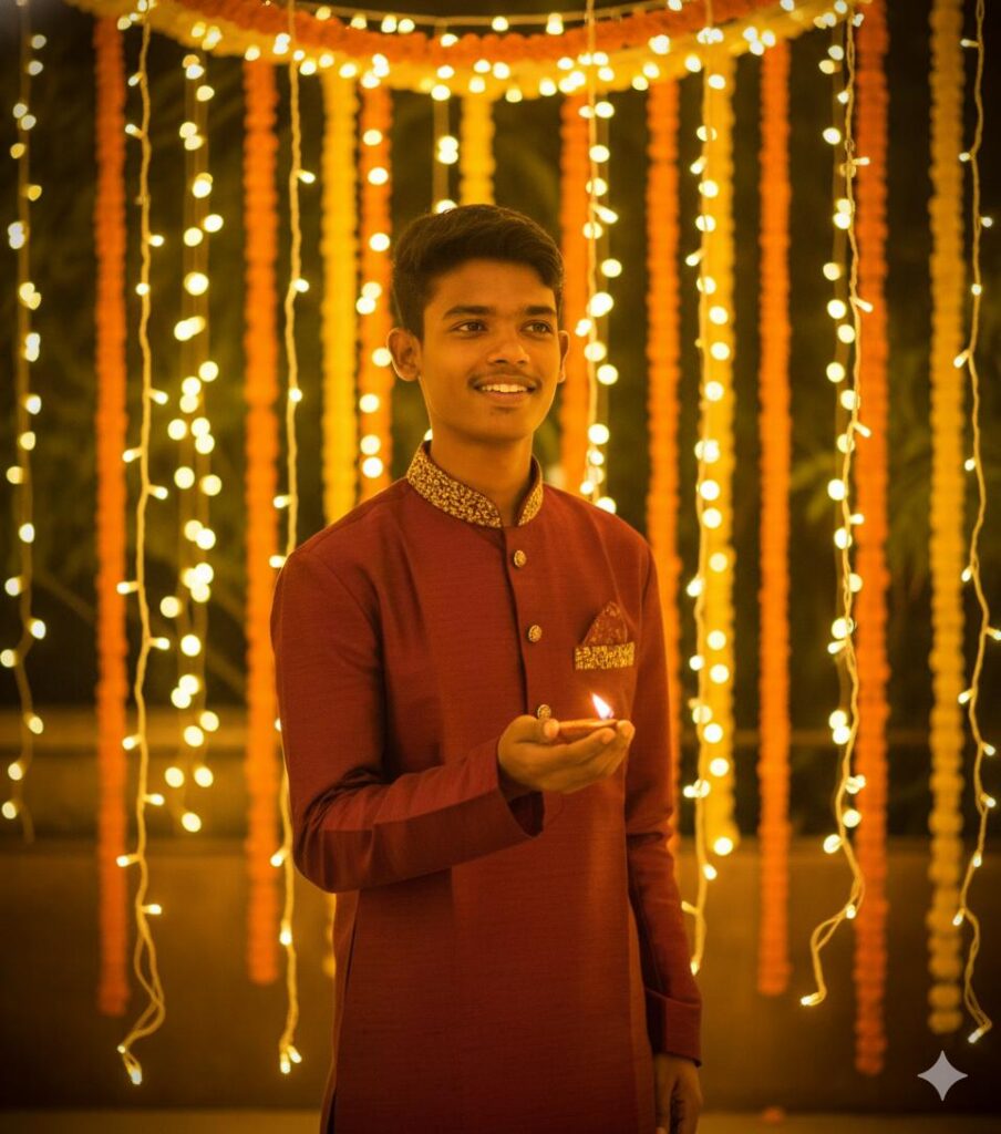Pick a photo where you’re holding something (like a diya or just hand up) — this helps you later place sparkler effects naturally.