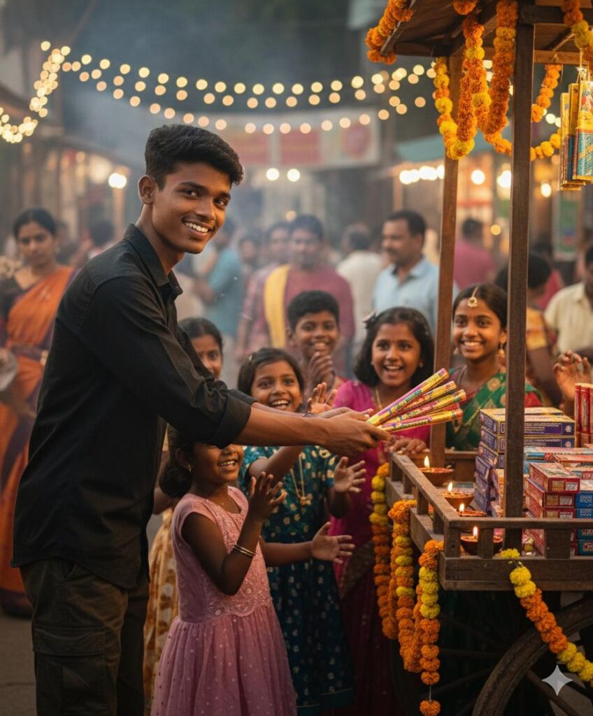 Indian male in a black shirt, smiling as he hands Diwali firecrackers to several excited children in front of his traditional wooden cart.