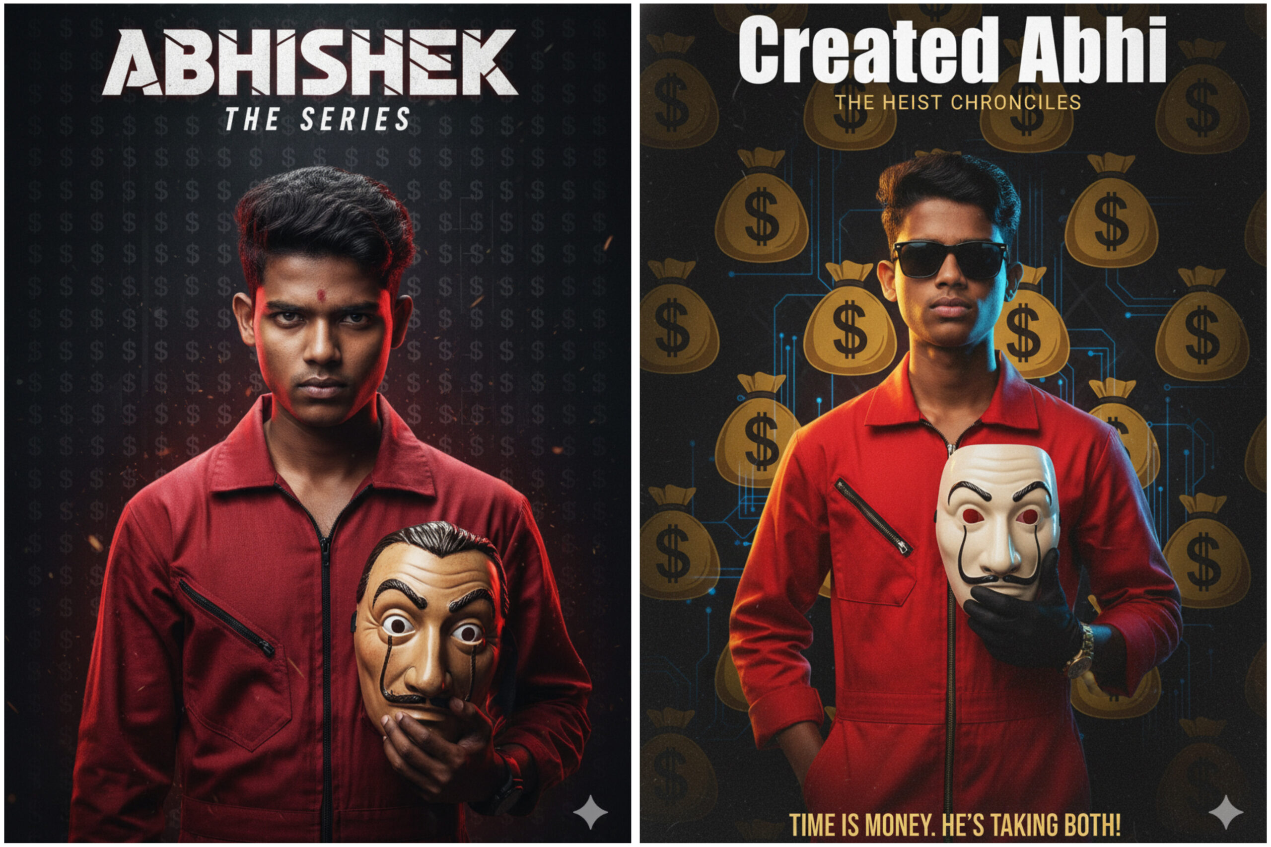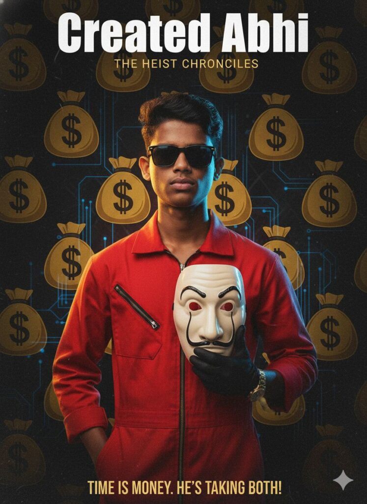 A dramatic, portrait-oriented movie poster titled “YOUR NAME” The central figure is a young man with 1000000% exact face above I mentioned image and wearing a red zip-up jumpsuit or hoodie, standing confidently with his left hand in his pocket and holding a Salvador Dalí mask in his right hand. He wears black sunglasses and has a serious, mysterious expression. The background features a pattern of gold money bags ($ symbols) with a subtle digital circuit design, giving a high-tech heist theme. The title text “YOUR NAME” appears boldly at the top in white, with the subtitle too small “THE HEIST CHRONICLES” in gold below it. At the bottom, a tagline reads: “TIME IS MONEY. HE’S TAKING BOTH!” The lighting is cinematic – warm highlights on one side of the face and cool blue shadows on the other. The overall tone is dark, dramatic, and high contrast, evoking a Money Heist-inspired aesthetic.