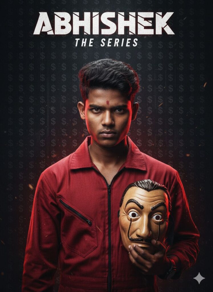 A dramatic, portrait-oriented movie poster for ‘ABHISHEK ‘ The central figure is a serious-looking, a young man (use 100% face refrence from uploaded image) with dark hair, wearing a vibrant red zippered jumpsuit or hoodie. He holds a Salvador Dalímask in his left hand, partially obscuring the lower-right side of the image, with the mask’s face angled slightly towards the viewer. The background is dark and textured, featuring a repeating, distressed